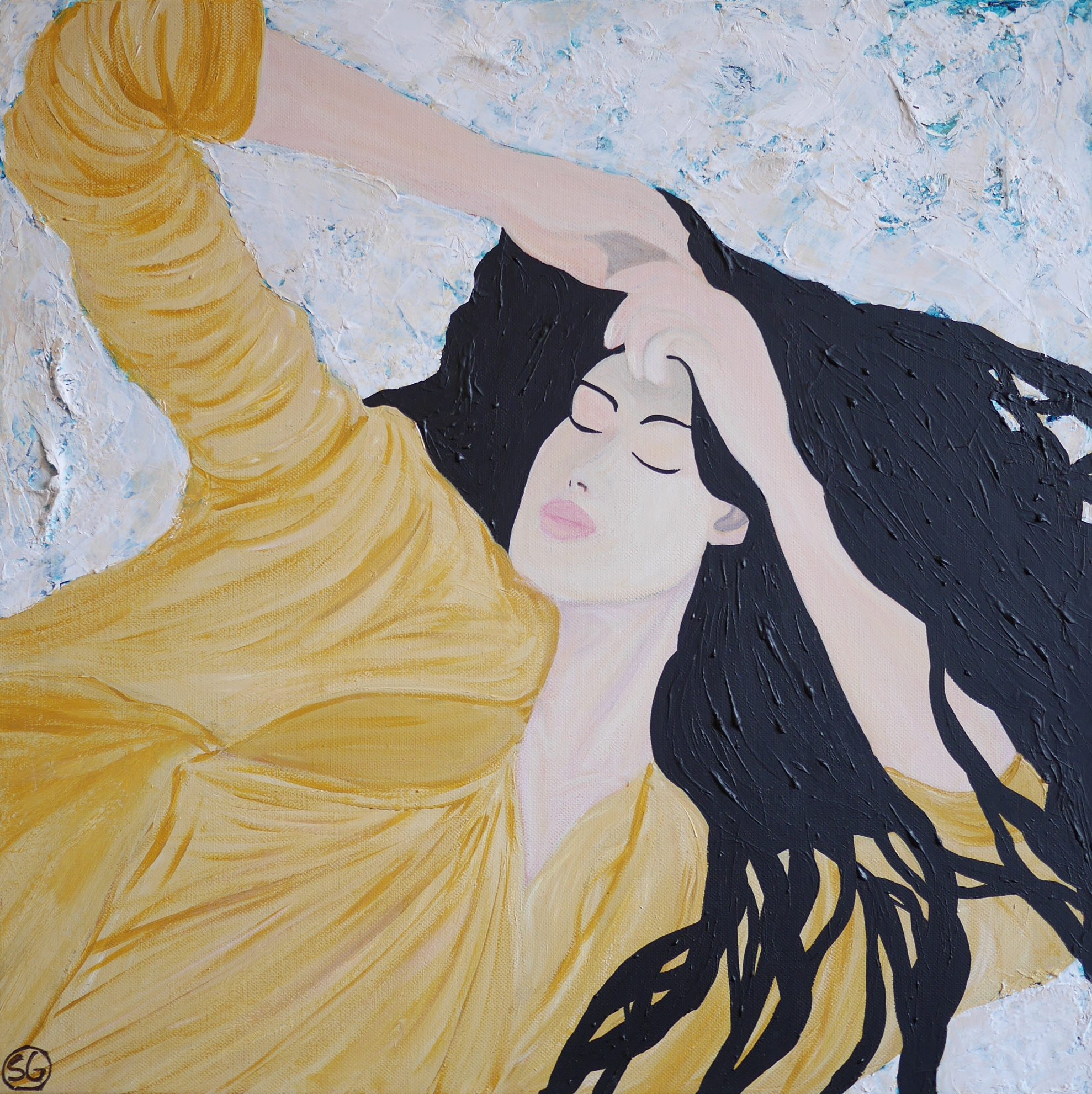 Une belle endormie, comme les appelait Kawabata. Cette femme s’est posée sur le sable, un jour de beau temps, il fait chaud. Elle s’est immédiatement assoupie et l’on imagine qu’elle est en train de rêver, sur cette plage. A quoi rêve-t-elle ? A qui ? Attend t-elle quelqu’un ? A-t-elle pris un bain de mer ? Elle est posée sur ce grand pareo, le corps complétement relâché, détendu, une main sur le ventre, sa chevelure étalée autour d’elle, sa lourde jupe repliée. Le moment est aussi calme que l’eau a l’horizon. On ne veut pas la déranger.