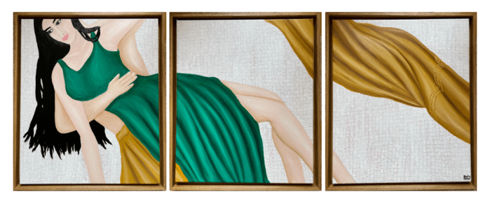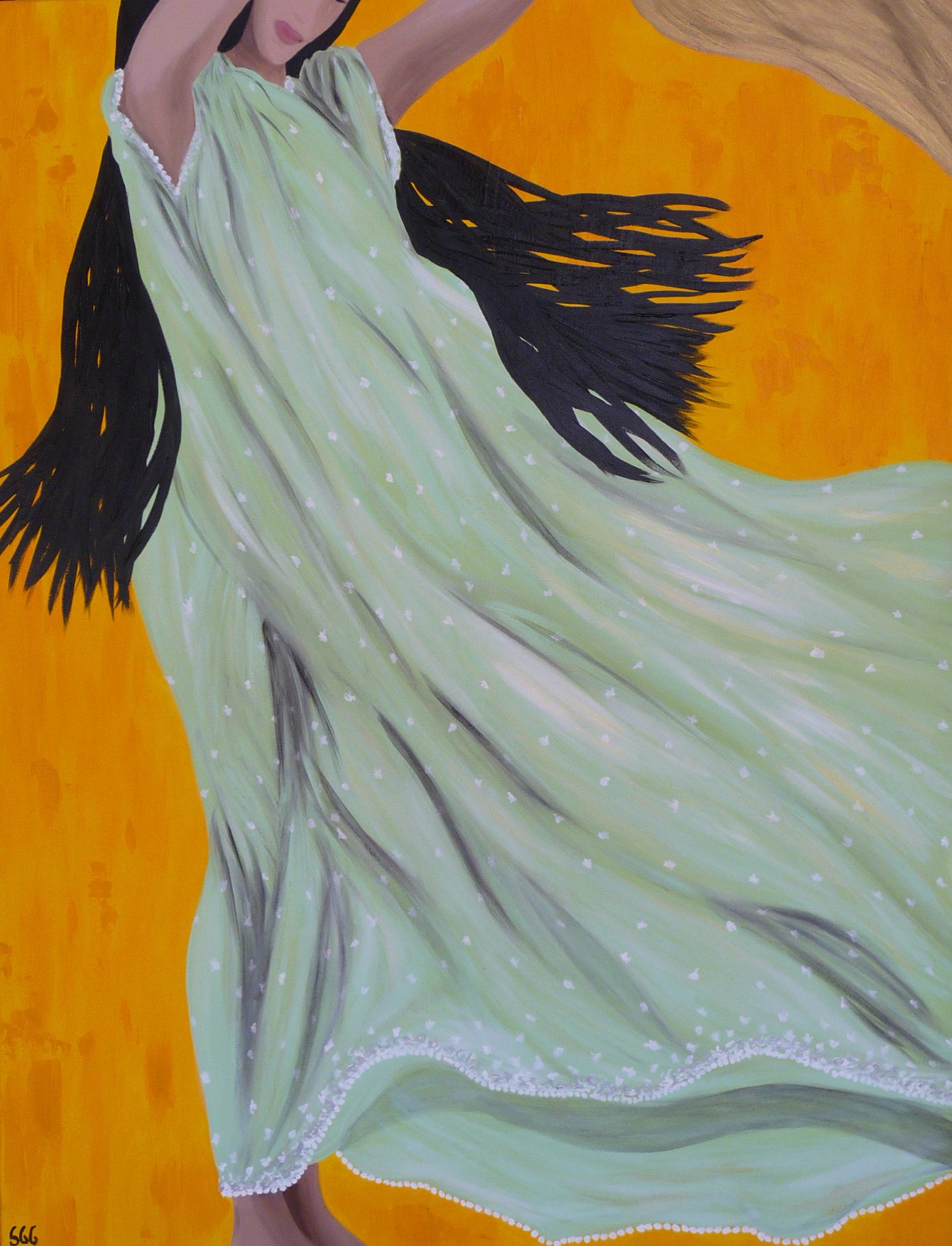 A barefoot Indian goddess who dances in the air, as if her whole body were floating in the warm, dark night air. The folds of the heavy silk fabric of her saree move with her dance steps, as if in a slow, swaying movement. Contrasting with the gloom, the gold and fuchsia embroidery on her skirt sparkles. All that’s missing is the tinkling of her bracelets, the swaying of her lithe body and her long hair, which the canvas also lets us imagine. Is it a ball? A party? A moment of grace in her eagerness to stroll at nightfall? Who is she walking towards? Is she impatient or dreamy?