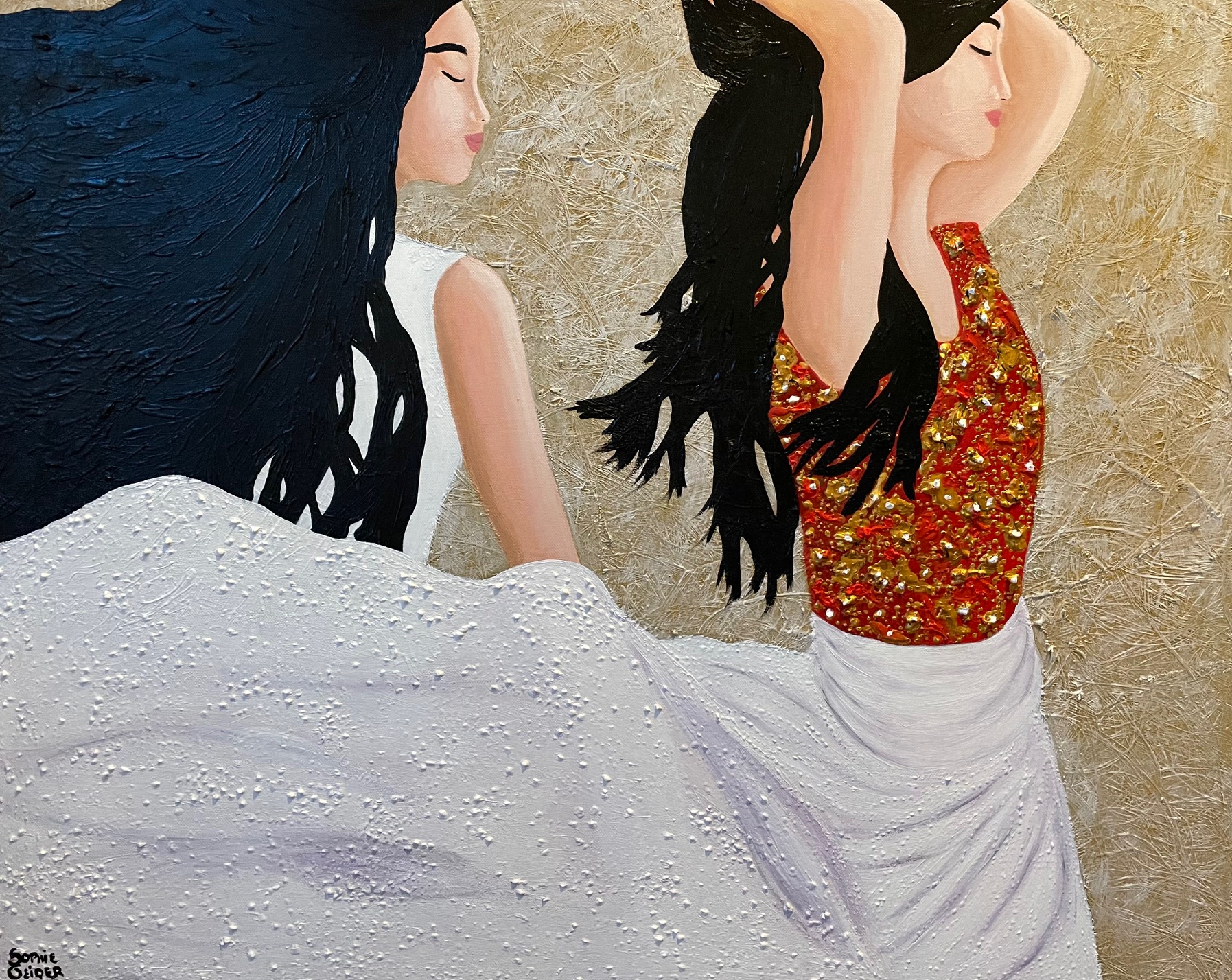 C’est un moment d’intimité dans une chambre aux murs rouge ardent, ou dans un lieu de bain. Une femme se déshabille, enlève son kimono de soie brodé, lentement, le laissant glisser dans le bas de son dos. Elle n’est pas seule. Elle suspend son geste, car elle perçoit derrière elle une conversation, des murmures, peut-être un secret y est dévoilé. Elle détourne légèrement la tête pour écouter. Elle a les yeux fermés, comme si cela l’aidait à mieux entendre, comme si elle pouvait ainsi mieux absorber ces sons.
