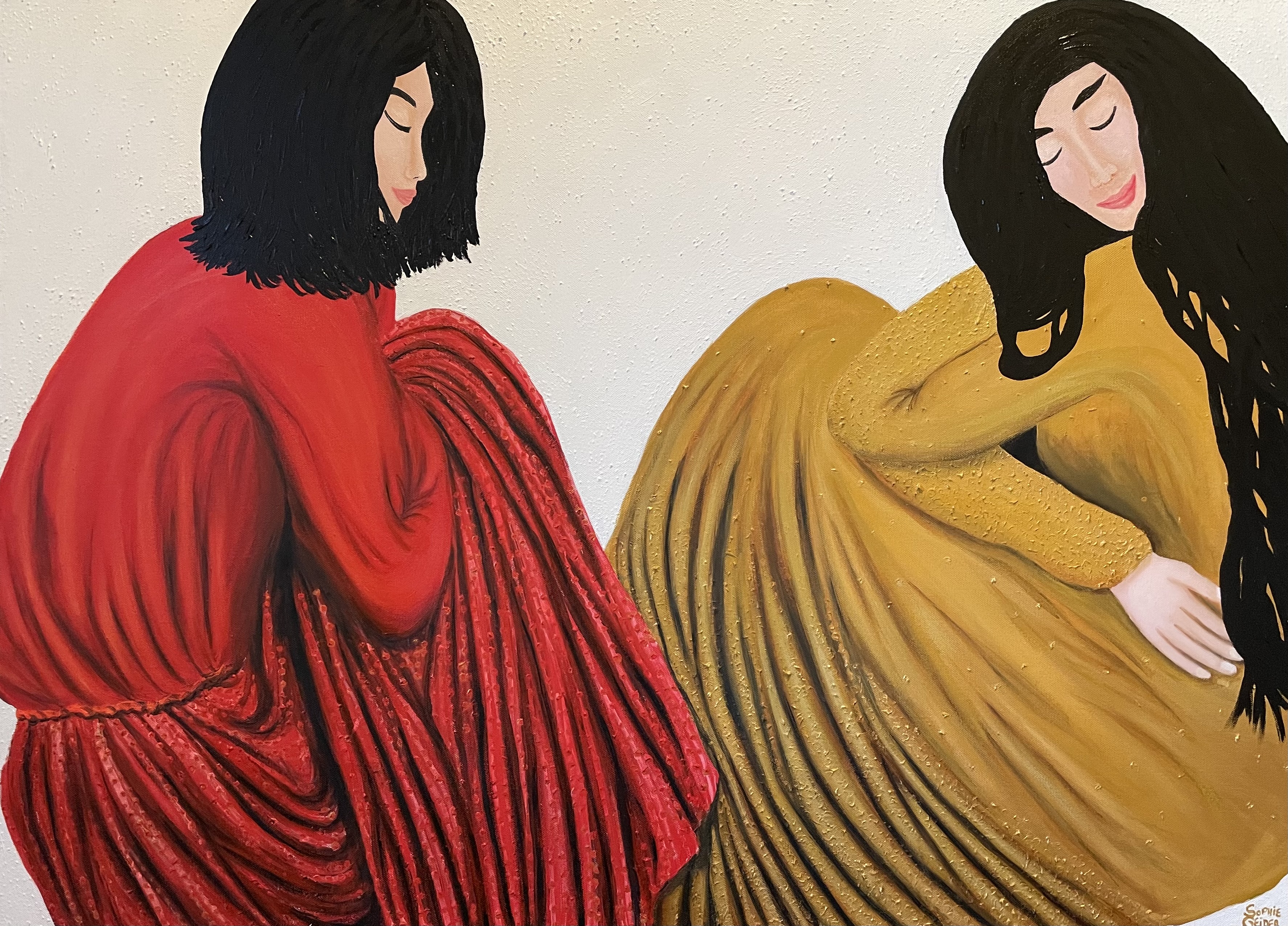 Deux amies, deux sœurs, assises sur le pas d’une porte, cachée par l’embrasure, ne dévoilant que le bas de leurs lourdes jupes brodées. Elles discutent, en secret, se racontent, chuchotent des histoires de filles, de femmes, d’amantes. On les devine bouche contre oreille, le visage penché l’une vers l’autre. On entend le froissement des tissus, les murmures mais l’on ne saura pas, on ne peut que deviner, imaginer.
