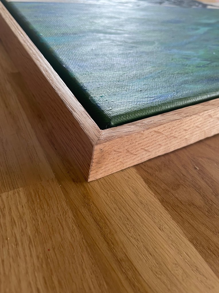 Les petites toiles sont encadrées en bois naturel (chêne français). L’encadrement des grandes toiles est offert et réalisé sur commande, en fonction de l’œuvre et du lieu d’exposition.